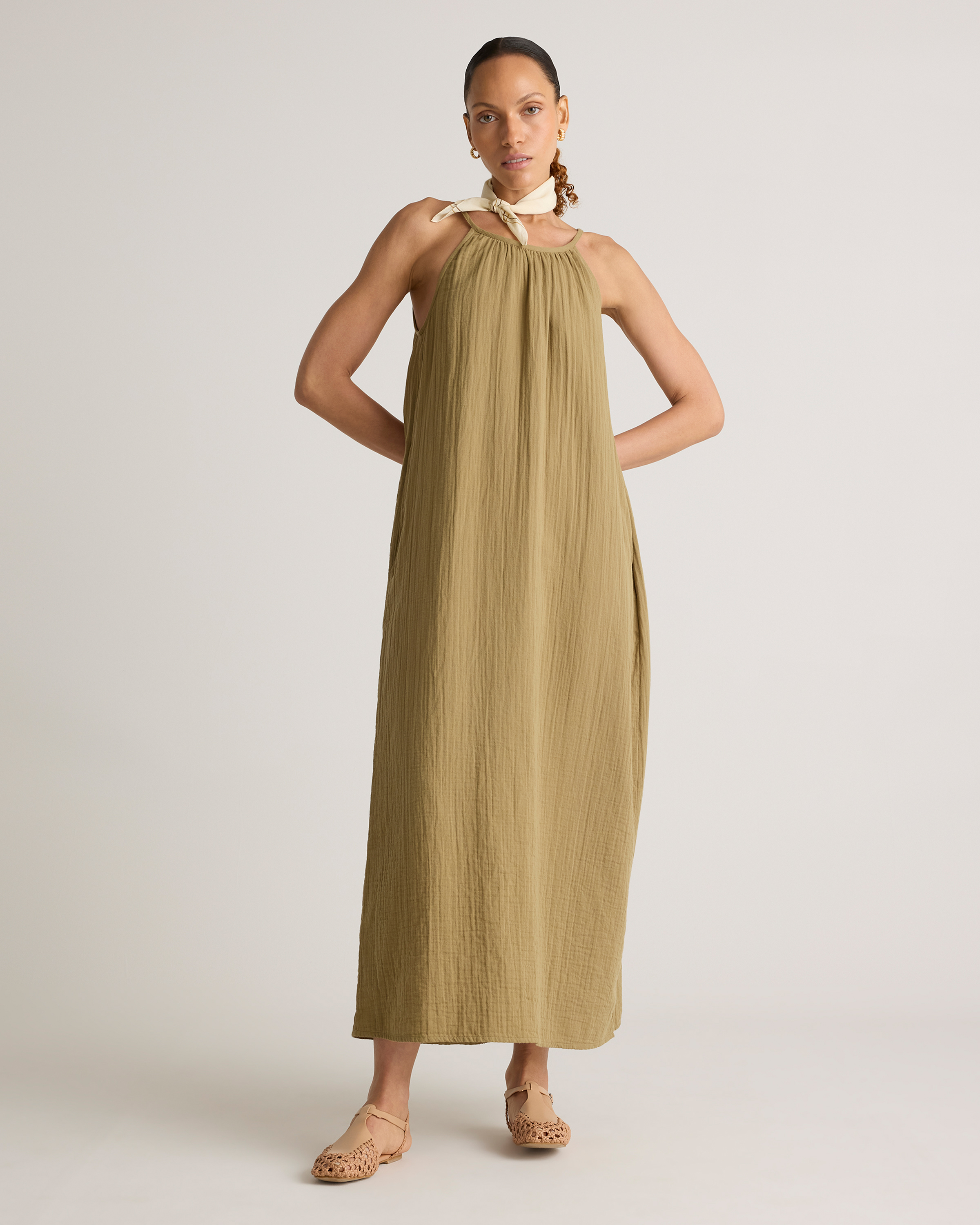 Our 100% Organic Cotton Gauze Sleeveless Maxi Dress is perfect for hot summer days, beach vacations, or evening strolls. With its elegant maxi length and high neck design, this dress ensures you’ll look polished and put-together for any occasion. Made of breezy, lightweight organic cotton gauze, this dress will keep you cool all summer long!