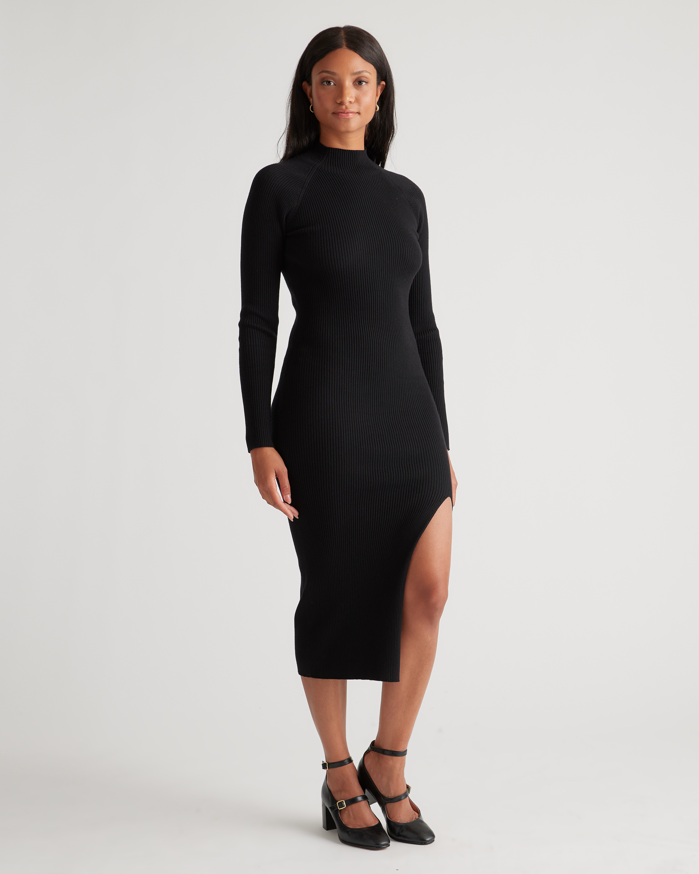 Take sweater dressing to a whole new level. With an allover ribbed texture, mock neck, and thigh-high slit, our Eco-Knit Ribbed Mock Neck Sweater Dress hugs your curves in all the right places. Made with a stretchy blend of high-recovery materials, this body-conscious silhouette will hold its shape —and make a lasting impression wherever you wear it.