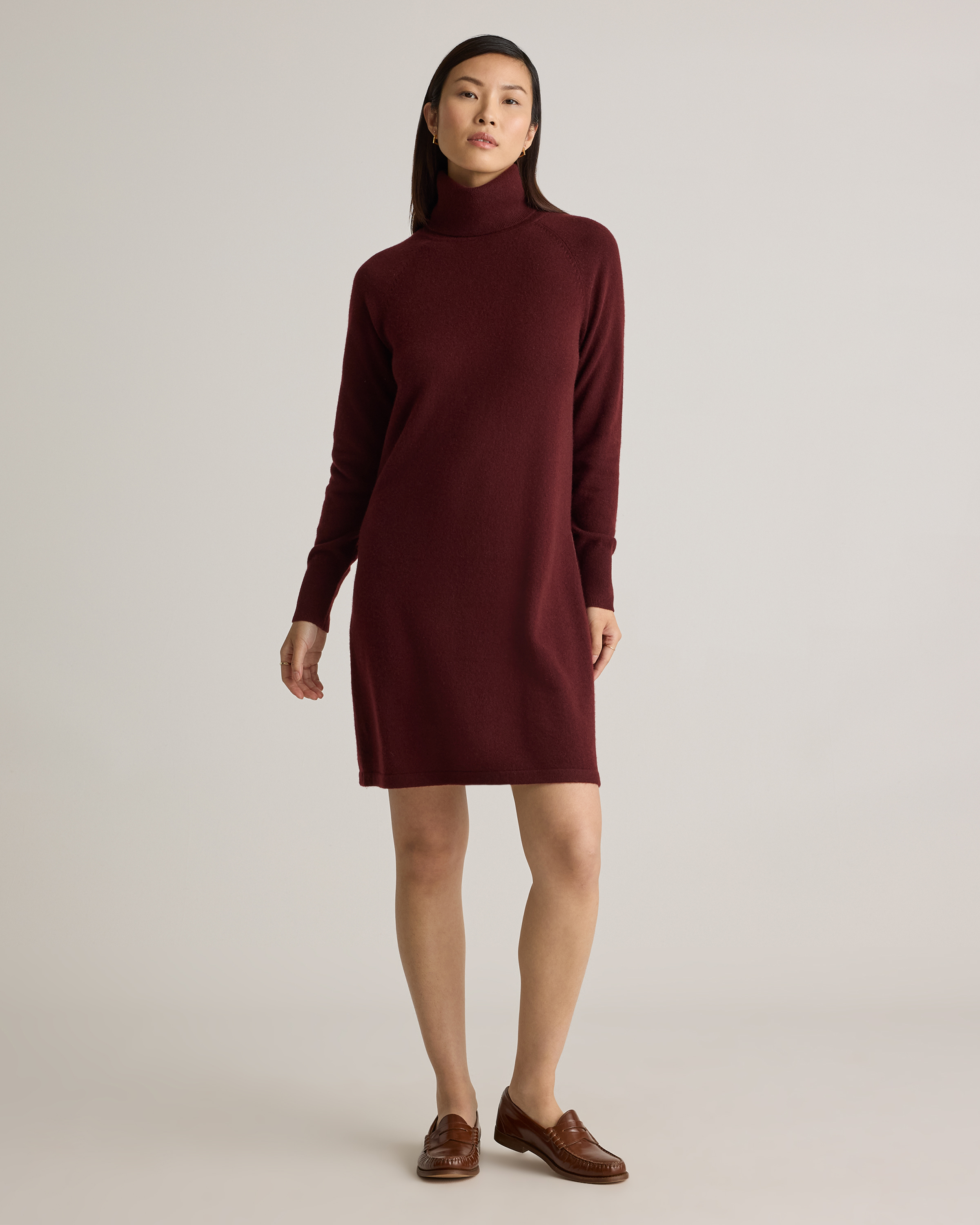 We love to keep cozy in this effortless cashmere turtleneck sweater dress. It comes in a relaxed, slim fit that’s both flattering and comfy. A turtleneck sweater dress is timeless, but a cashmere one? Chefs kiss. Our quality cashmere is incredibly long-lasting and three times as warm as wool, sourced sustainably and ethically. Read more on what makes it special in our Cashmere 101.