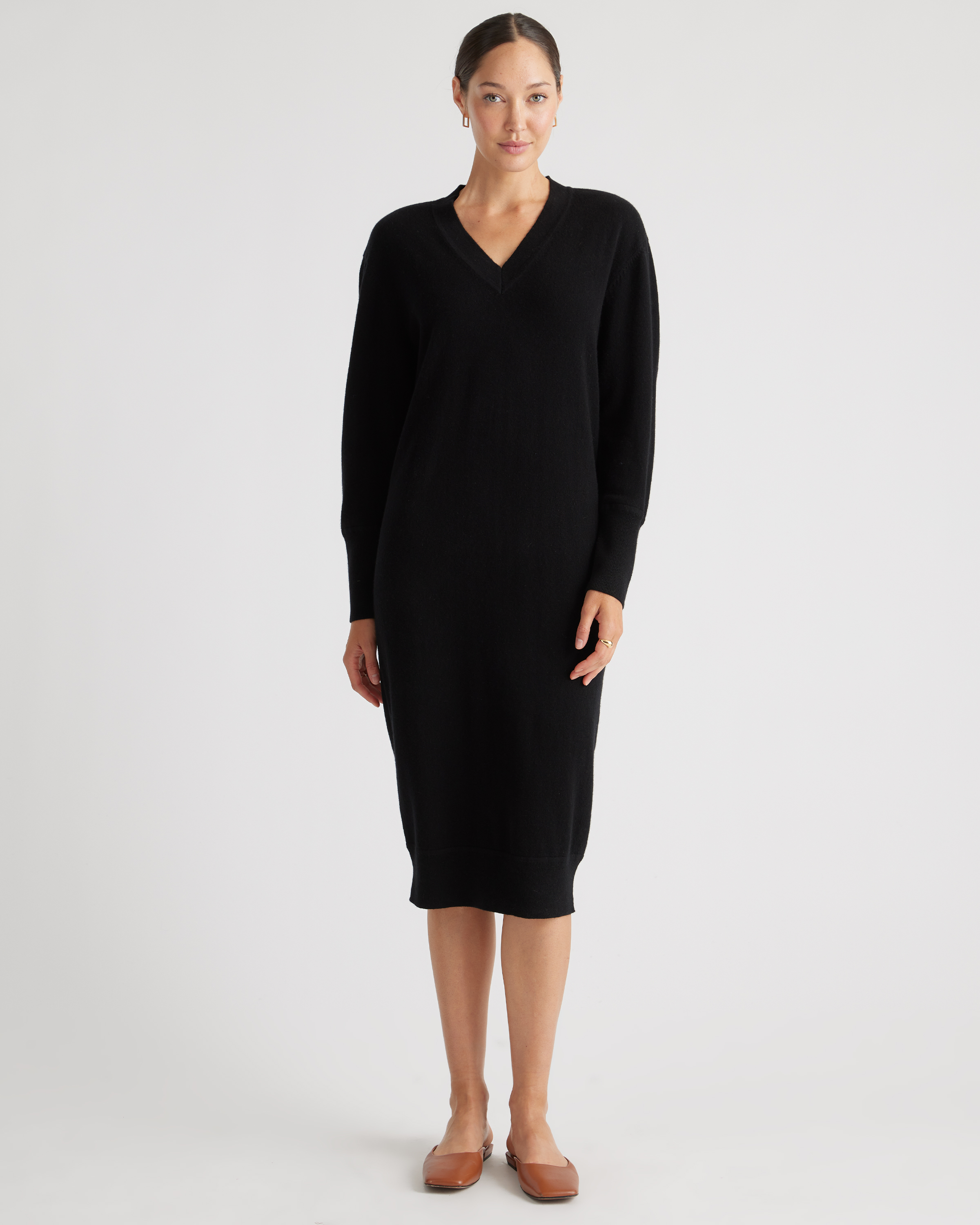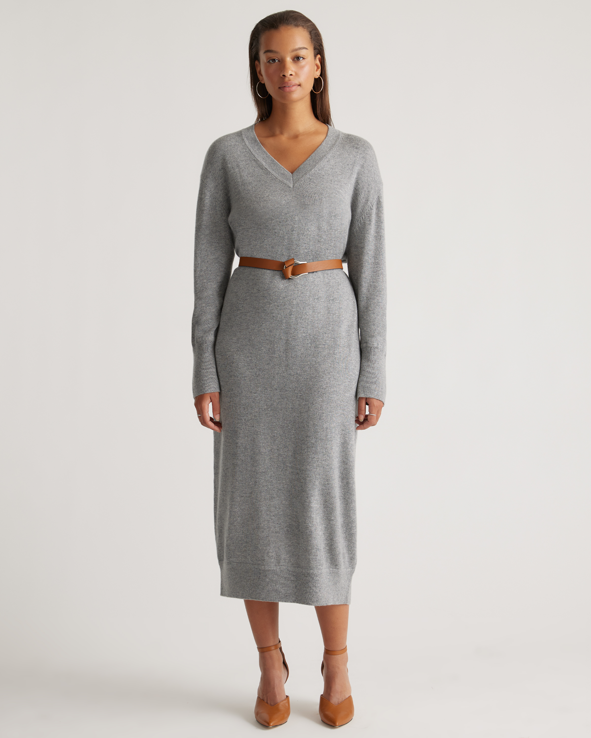 It’s a luxe cashmere sweater and a flattering midi dress all in one. Our Mongolian Cashmere V-Neck Midi Sweater Dress is crafted from Grade-A cashmere sourced directly from Mongolia, in a fine-gauge knit that feels warm and cozy without bulkiness. With a wide V-neckline and body-grazing fit, this chic silhouette works for day or night—and it’s so soft and comfy, you might never want to take it off.